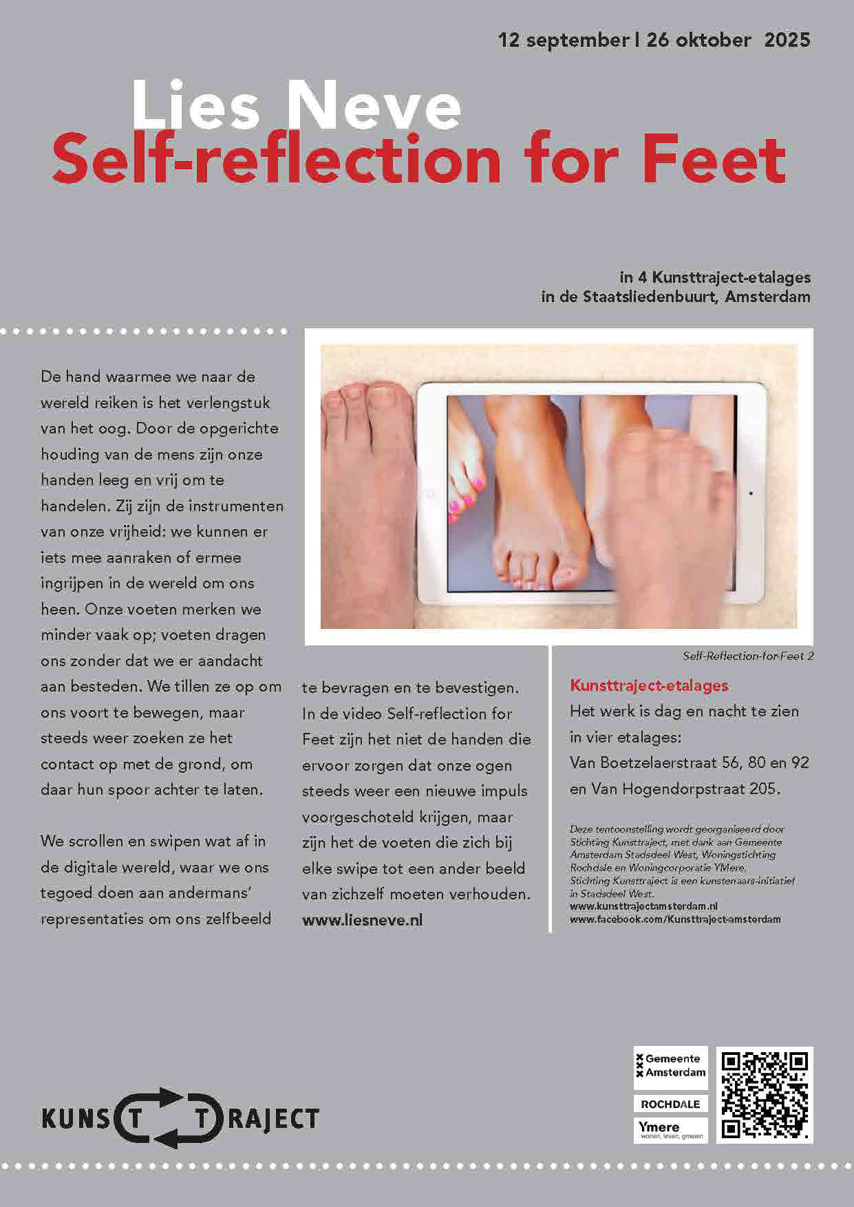We scrollen en swipen wat af in de digitale wereld, waar we ons tegoed doen aan andermans’ representaties om ons zelfbeeld te bevragen en te bevestigen. In de video Self-reflection for Feet zijn het niet de handen die ervoor zorgen dat onze ogen steeds weer een nieuwe impuls voorgeschoteld krijgen, maar zijn het de voeten die zich bij elke swipe tot een ander beeld van zichzelf moeten verhouden.